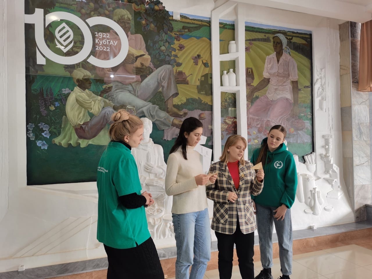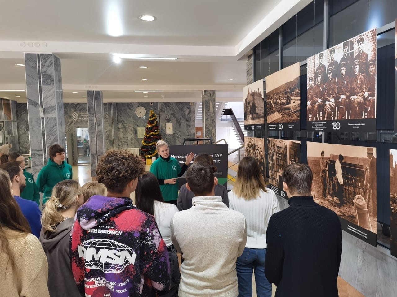 Четвертый этап квеста продолжился в холле главного корпуса на выставке «История КубГАУ: взгляд сквозь столетие». Начали экскурсию по фотовыставке руководители «Поиска», а завершили, показав свои знания об истории университета, команды участников.