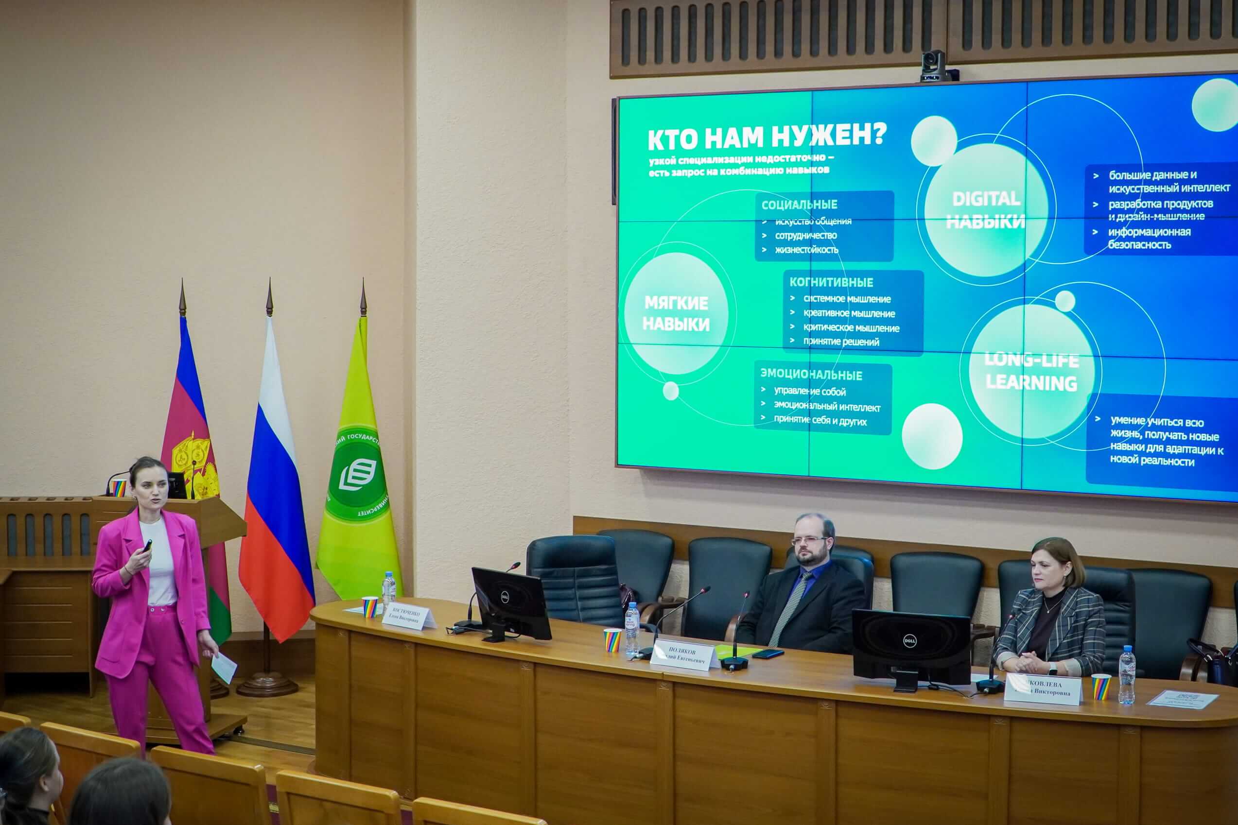 Начальник управления кредитования крупного и среднего бизнеса Елена Викторовна Костюченко рассказала обучающимся о Юго-Западном банке ПАО Сбербанк, типах образовательных траекторий, требуемых современному бизнесу, и указала, что узкой специализации уже недостаточно, требуется сочетание разнообразных навыков и непрерывное образование. Она подвела итоги первых двух выпусков Бизнес-школы Сбербанка и отметила, что в этом году программа была расширена на 2 семестра, а ее трудоемкость выросла на 25%.