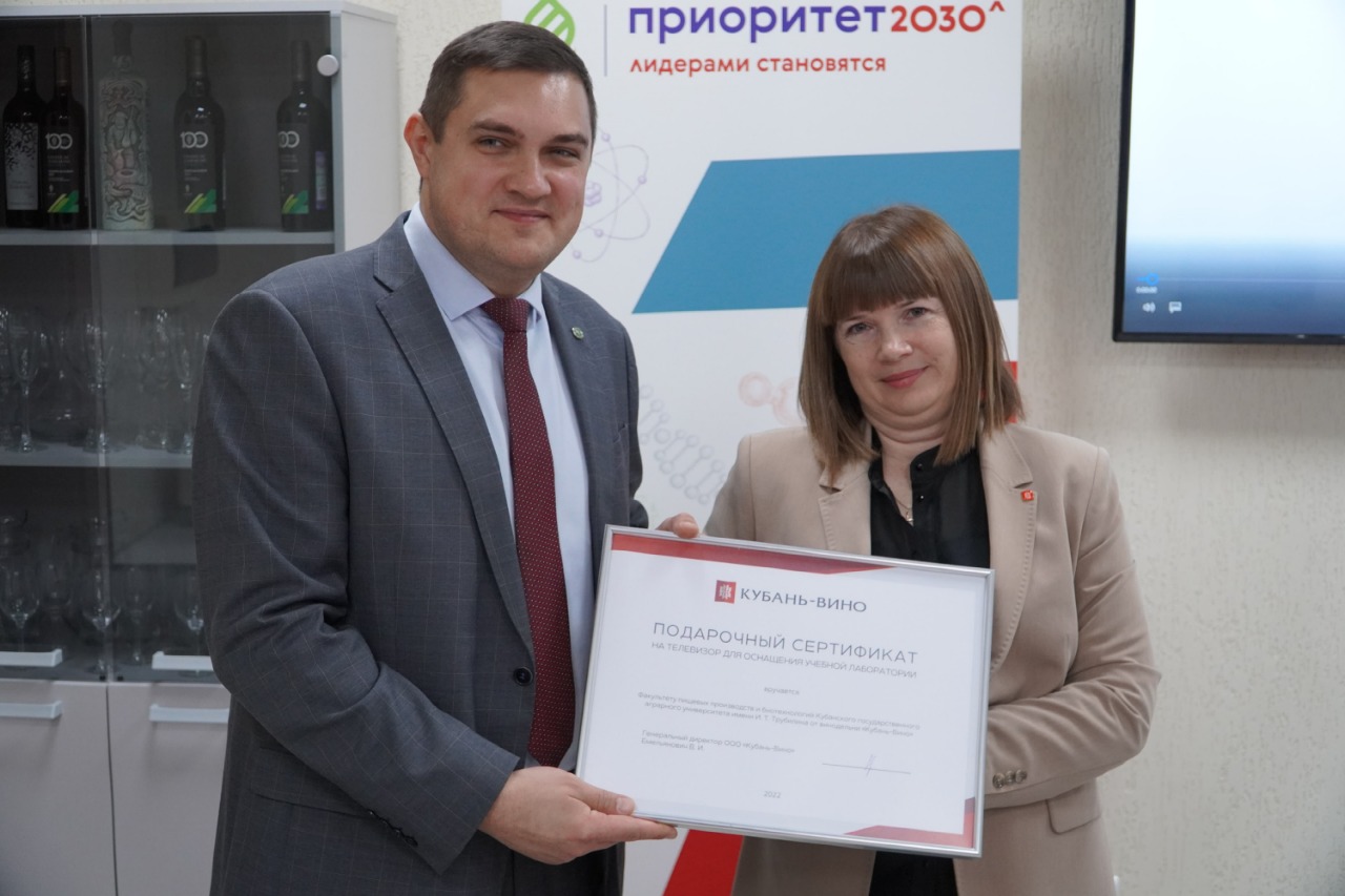 В ходе торжественной церемонии, руководитель компании «Кубань-Вино» Виктория Емельянович подарила факультету сертификат на широкоформатный экран, который был накануне установлен в этой лаборатории для проведения занятий. Ректор Александр Трубилин, в свою очередь, вручил бывшей выпускнице КубГАУ книгу, посвященную столетию университета.