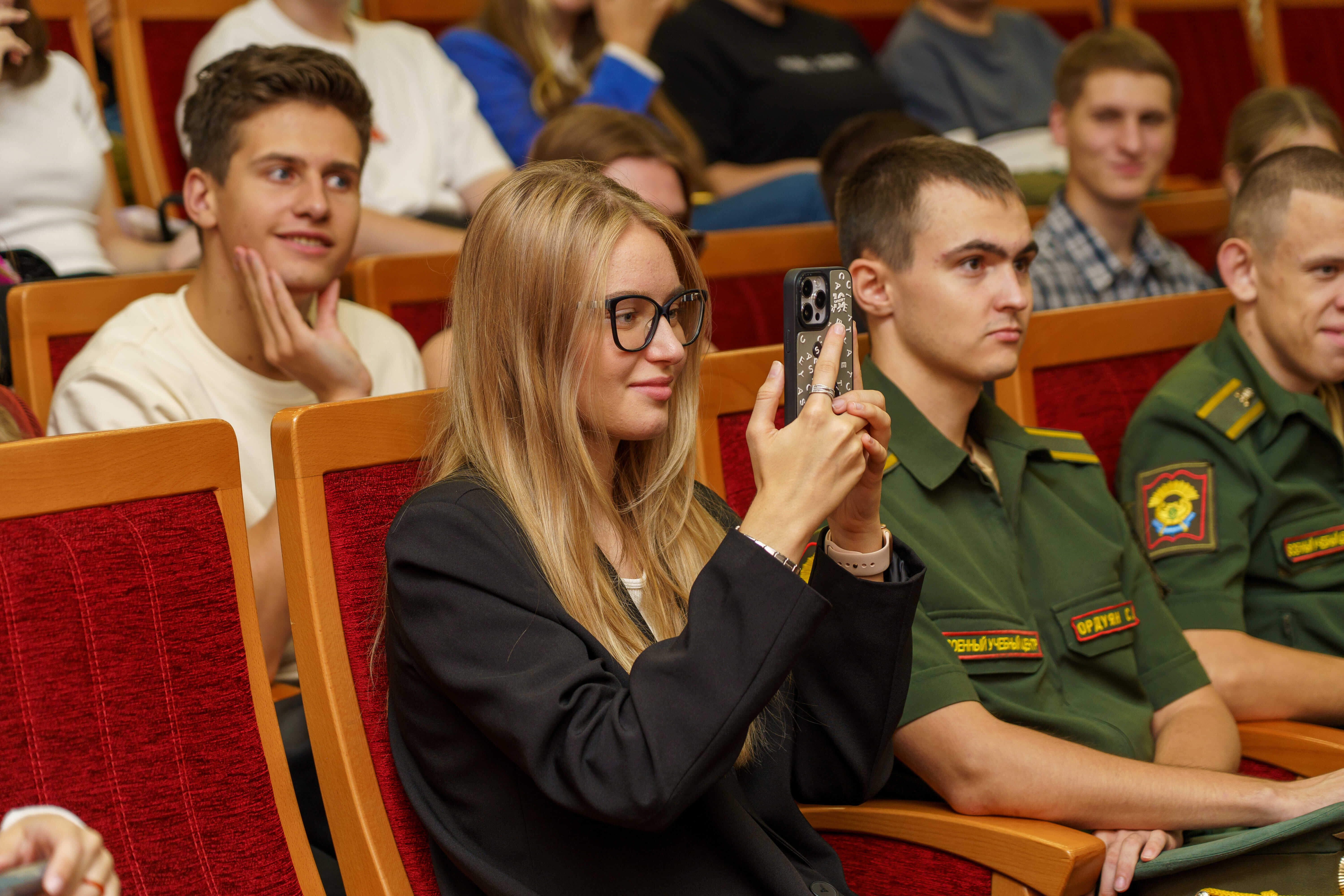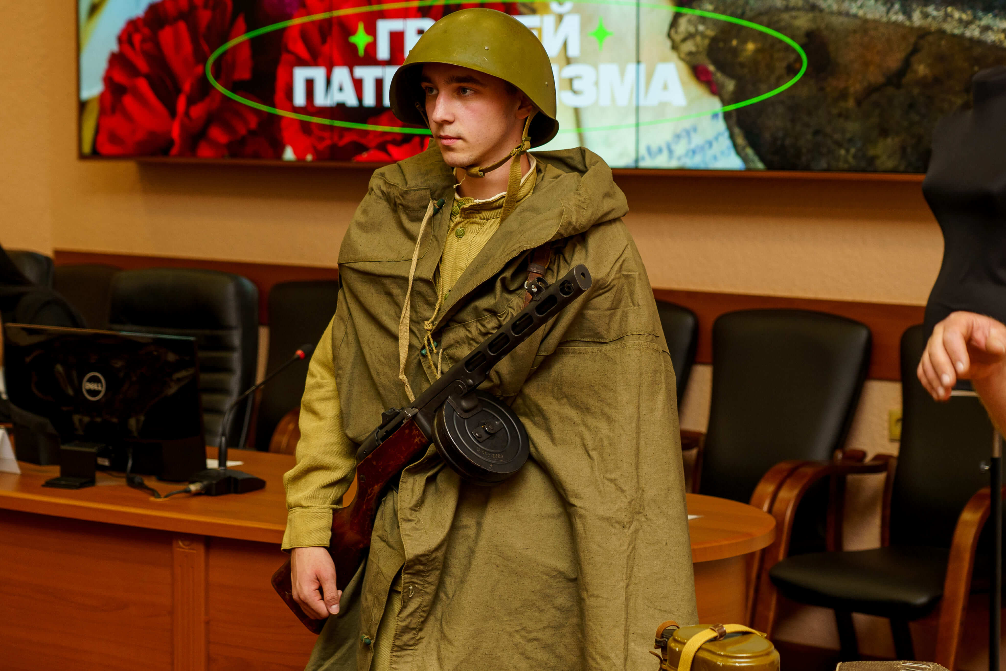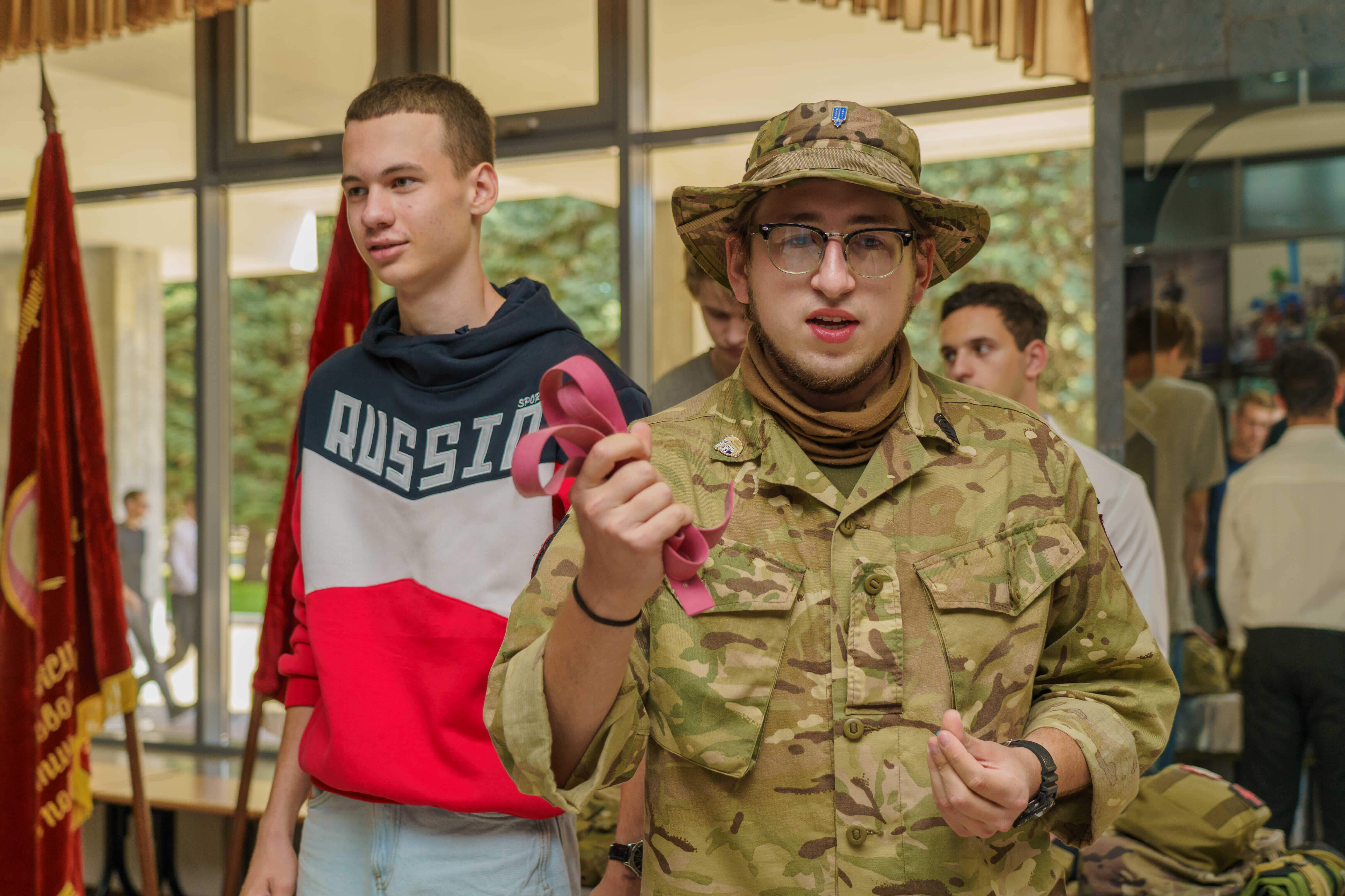 Алексей Анатольевич рассказал ребятам о снаряжении и форме Красной Армии, а также показал на одном из студентов университета, как и во что был одет солдат тех времен.