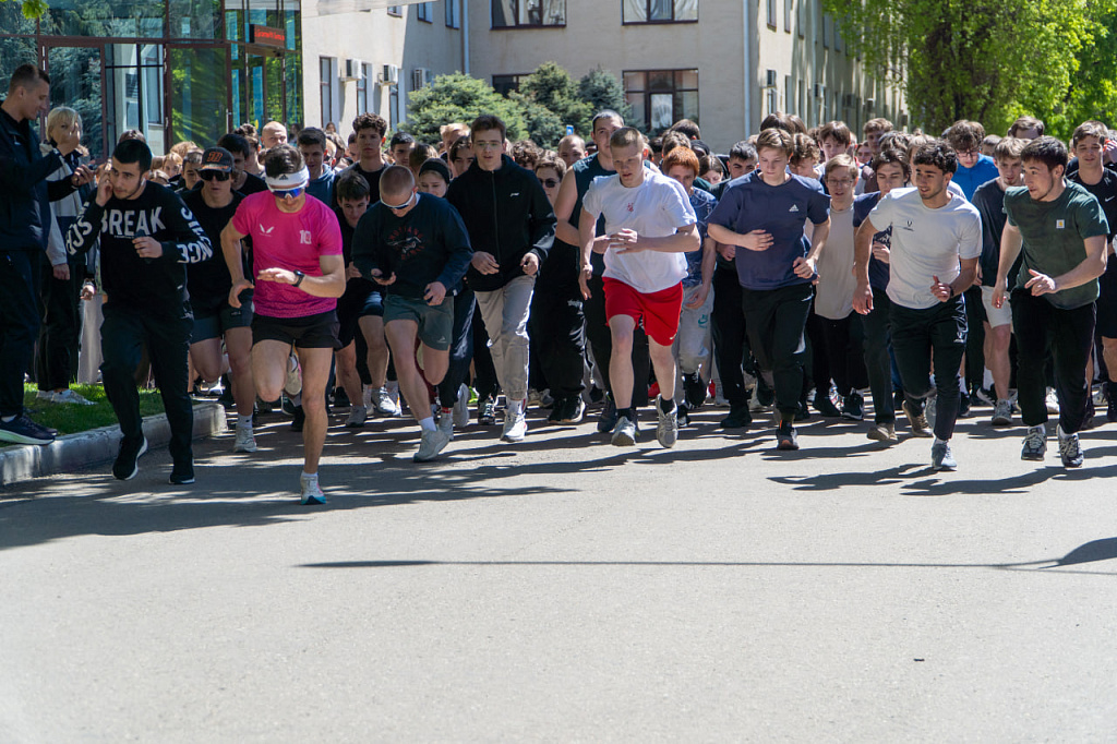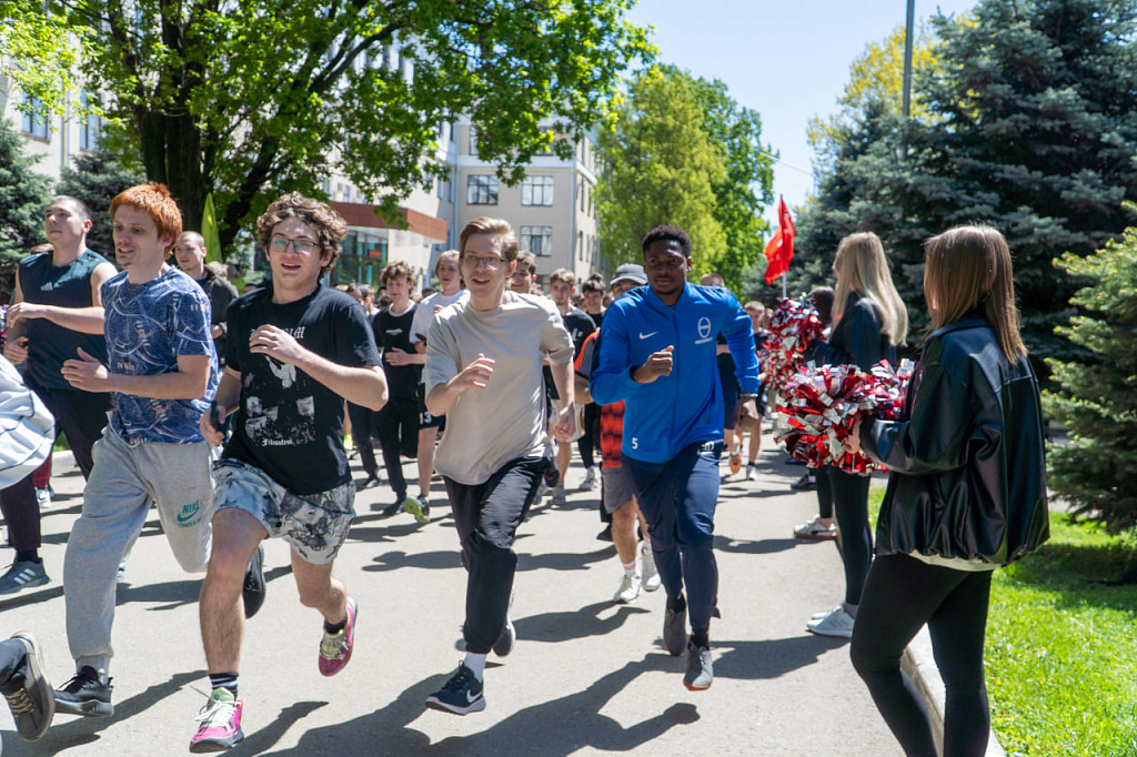 Более 500 человек начали с общей разминки вместе с преподавателями кафедры физического воспитания, затем вышли на старт и преодолели дистанцию единым потоком.